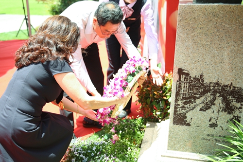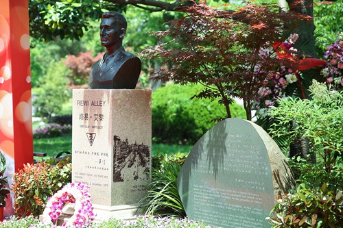 ▲国际殡葬协会主席Teresa(左)和中国殡葬协会会长李建华(右)向路易•艾黎纪念像敬献花环
